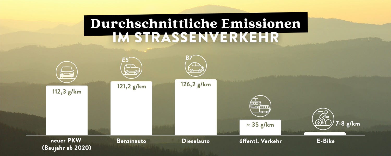 Und hier kommt das E-Bike in mehrfach positiver Hinsicht ins Spiel. Pedelec-Fahrer:innen sind erfahrungsgemäß öfter und länger mit ihrem Bike unterwegs, als Nutzer:innen von herkömmlichen Fahrrädern. Weil durch die mögliche technische Unterstützung Gegenwind, weitere Strecken, Steigungen und Co. nicht mehr so leicht abschrecken und Biker:innen nicht an ihr körperliches Limit gehen müssen. Und damit entlastet die Nutzung der Elektrofahrräder den Stadtverkehr und die Umwelt. Sie verursachen nämlich bei weitem weniger CO₂-Emissionen als Autos oder öffentliche Verkehrsmittel. Ja, richtig gelesen. Pedelecs sind auch umweltfreundlicher als Bus und Bahn. Dazu gibt es bereits wissenschaftlich anerkannte Studien. Den größten Vorteil bietet das Elektrofahrrad gegenüber PKWs. Wusstest du, dass ein Kleinwagen rund 23-mal so viel CO₂-Emissionen verursacht wie ein E-Bike? Und dass 100 gesparte Autokilometer die Herstellung eines E-Bike-Akkus wieder ausgleichen? Ein Geero Akku braucht übrigens keine 62 Autokilometer (!), um die Produktion eines Akkus auszugleichen.
